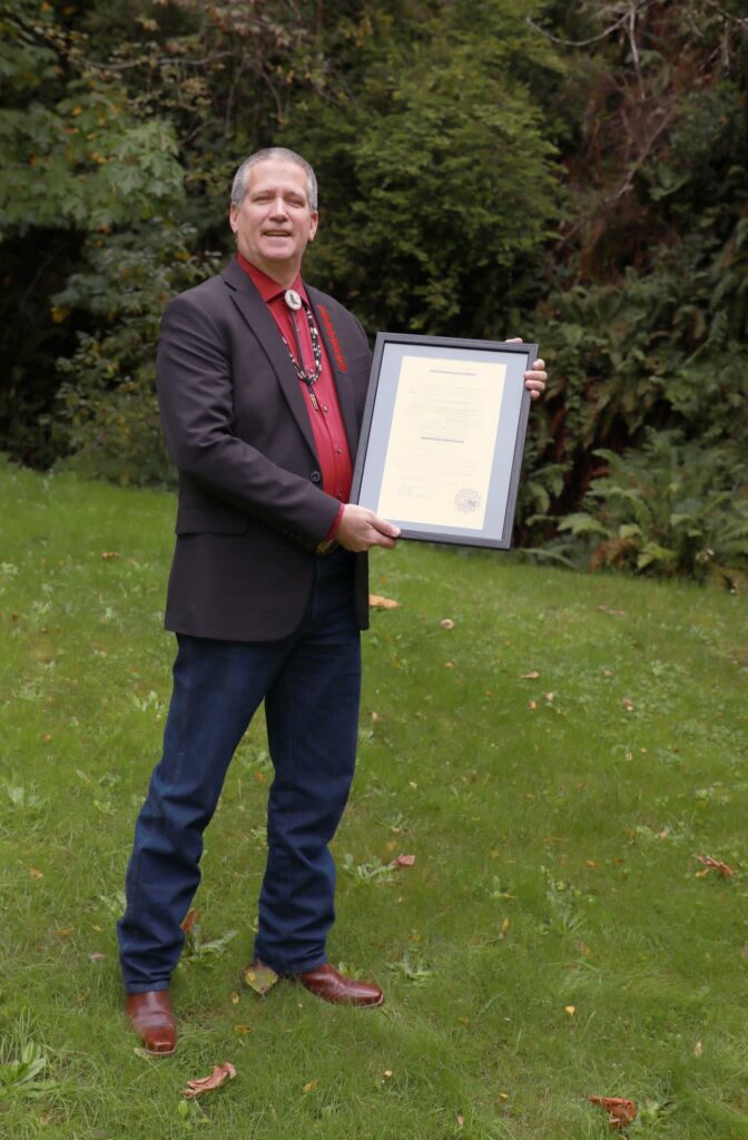 Captions: (Above) Toby Vanlandingham posing with his election resolution after being sworn in for his 3rd term as a Yurok Tribal Council member representing the Weitchpec district.